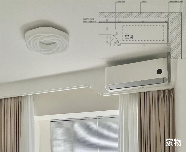 就拿卧室来说,若开间足够大的话,甚至可以把空调做在窗帘盒的下沿位置,进行加固后又稳当又好看,正常使用也丝毫没有影响。