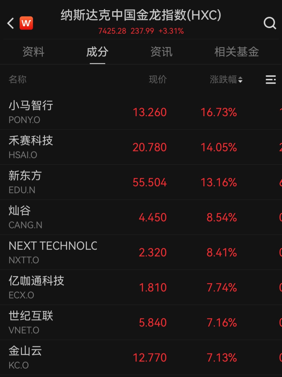 中概股大涨,纳斯达克中国金龙指数高开高走,收涨3.31%。小马智行涨逾16%,禾赛科技涨逾14%,新东方涨逾13%,灿谷等涨逾8%。